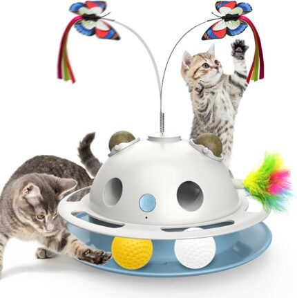 Cat Toys – 3 in 1 Interactive Automatic Kitten Toy, Fluttering Butterfly, Mobile Ambush Feather, Ball Track, Dual Power Sources, USB Powered, for Exercise, white