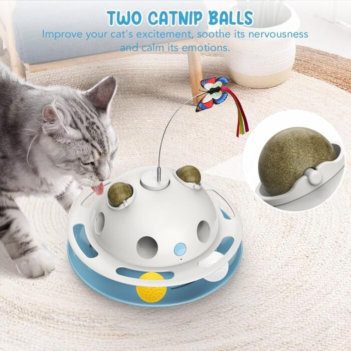 - 【4-in-1 Automatic Cat Toy】This cat toy set includes two catnip balls, a shooting feather, and a fluttering butterfly, all designed to keep cats entertained for hours. The fluffy feather keeps hiding and popping out from random holes, and the butterfly swings automatically, perfect for engaging play that mimics real prey, it provides both fun and exercise for your cat.