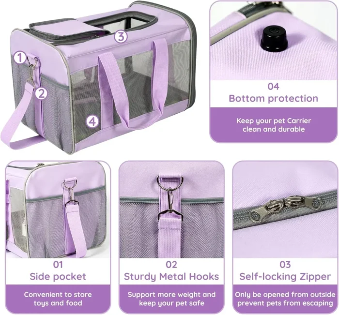 - CONVENIENCE: This small dog carrier has side pocket for food, bowl, or training items, like toys. The bottom side of the pet carrier design with four bottom protection, it can keep your pet carrier clean, and the top side of the pet carrier is designed with an ID card pocket allows for placement of the pet’s identification, such as ID tags, contact information, or ownership proof.